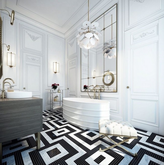 - Colored tiles on the floor should also support the style of the room. A bright floor with geometric lines in a classically decorated room or a tile in Turkish style in high-tech and minimalist styles will look pretty ridiculous.