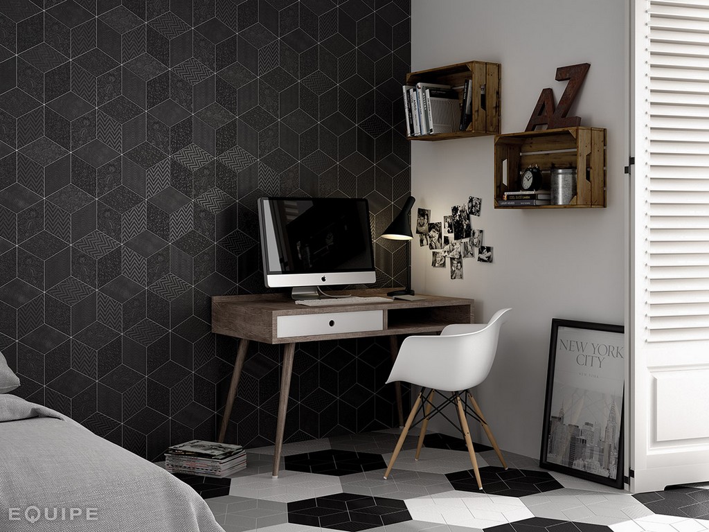So, for the high-tech style it is peculiar to cover dark reserved shades with a large geometric pattern, rolling from one element to another.