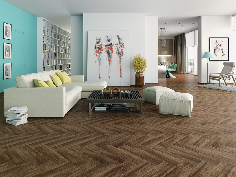 Colored floor tiles can have a different coating. It comes in matte or glossy. Also this coating can transfer various textures of materials, for example, brushed wood, concrete.