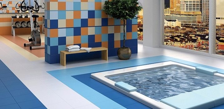 - With the help of colored tiles on the floor are separate zones. The floor around the pool is decorated in blue and blue and the gym area is decorated in warm shades of yellow and orange. These colors are connected on the wall, where they overlap with each other.