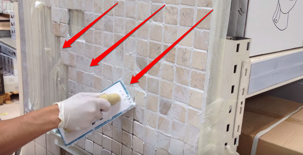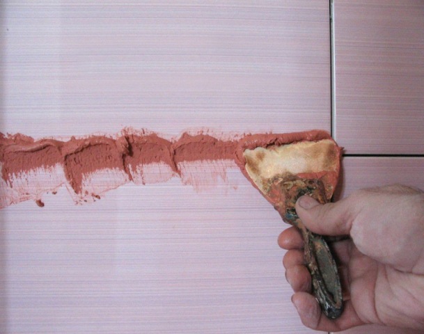 - We collect a small amount of the mixture on a spatula and grind on the surface. It is more convenient if two people work: the first one applies, the second one immediately blurs the grout.