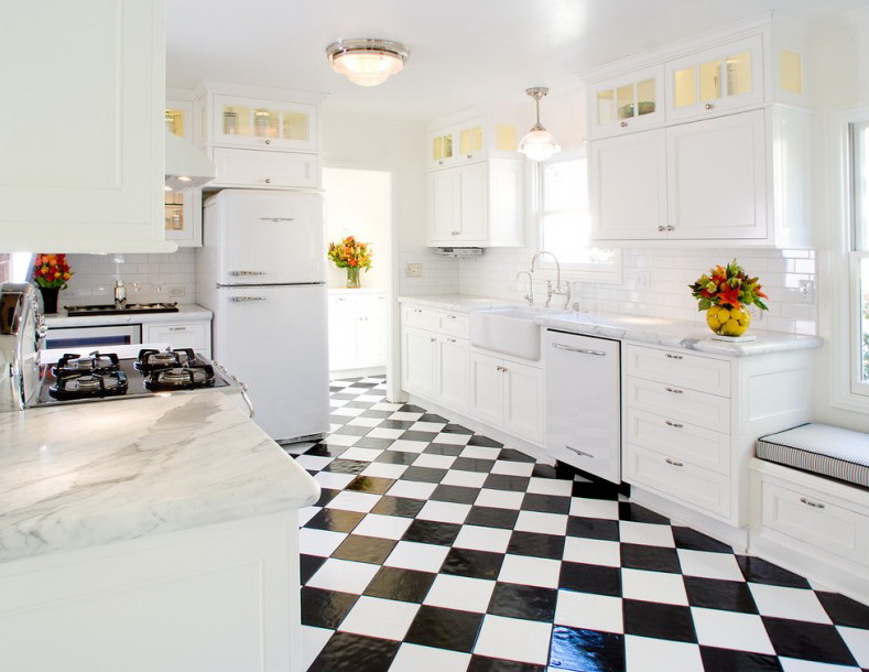 For example, black tile, diluted with white, is perfect for the art deco style, and will also look good in the kitchen, combined with white furniture.
