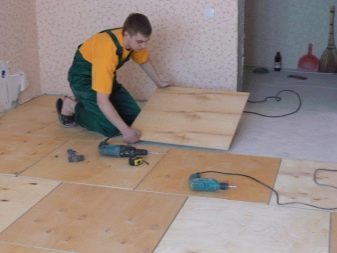In the presence of a wooden floor assembly foam is poured into all the cracks. Some prefer to additionally put plywood.. A reinforced mesh with cells is placed on top of it and filled with a special solution for wooden materials. Drywall is also used to level the surface with differences of more than six centimeters. Then, the remaining construction mixtures are applied.