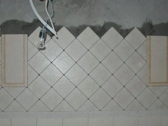 With this method of laying it is better to pre-lay the whole tile in the center of the room, and then all the rest were distributed from it towards the corners. In the bathroom, the center is defined between the place of bathing and the opposite wall.Sometimes, in order to avoid trimming tiles, the center is intentionally shifted.