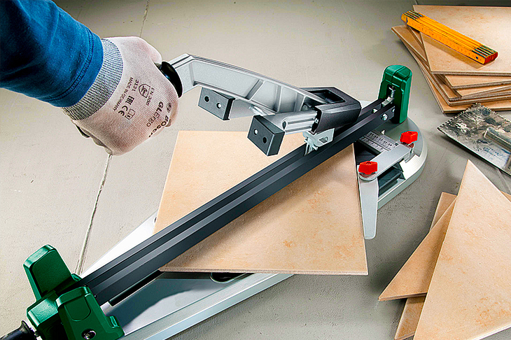 The tile is laid on the base of the tile cutter. After that, the blade tightly pressed against the plate and stretches the handle tool. Close attention should be paid to the correct direction of the blade in relation to the tile. All these manipulations need to be done at once, so that all edges come out smooth. As a result, the incision is broken open by hand.