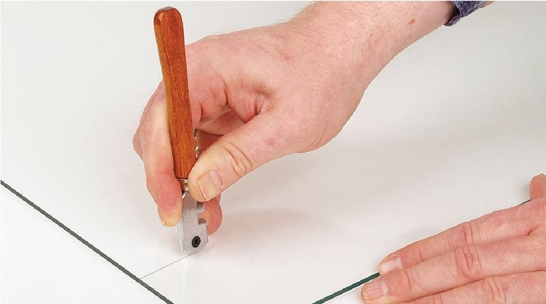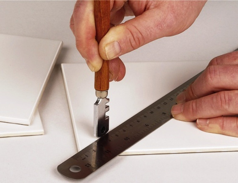 There is a special scheme for the use of a glass cutter at home. First marked the cut line. Tile should be laid on a horizontal surface to avoid slipping. Then the tool with a ruler is held straight. Strongly pressing the tile during this work is not recommended.