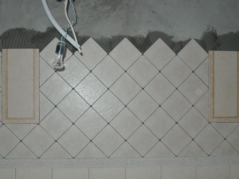 In the inner part of the rectangle, whole plates and halves will participate in the creation of the diagonal. In this case, the master should pay special attention to the clarity of the cut edge of the cut tile.