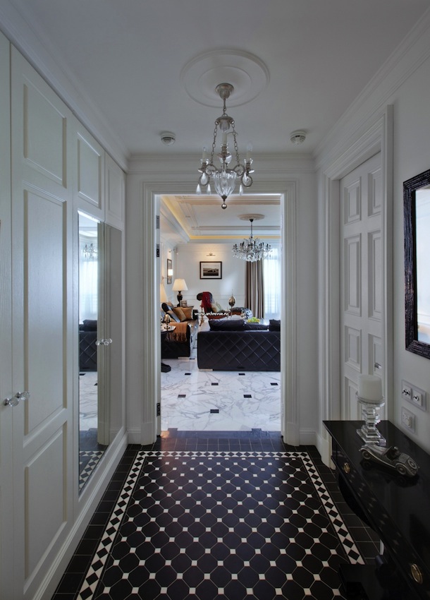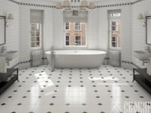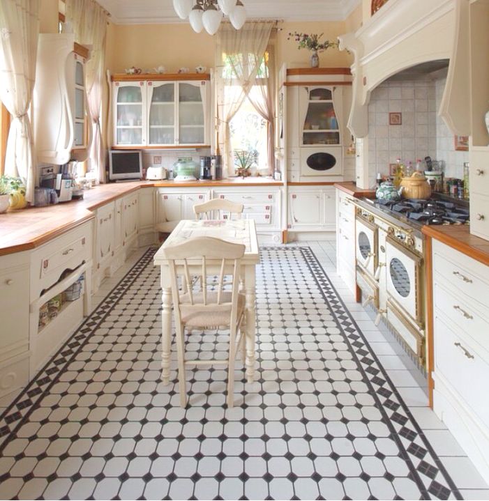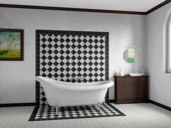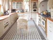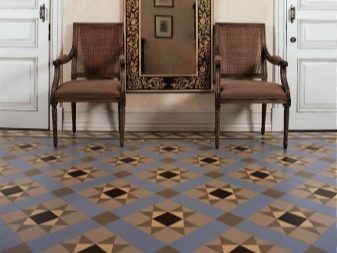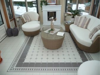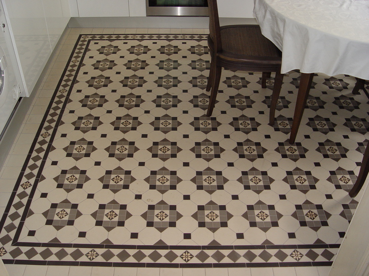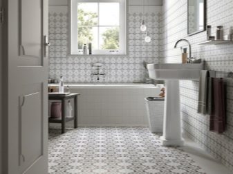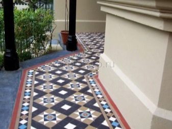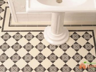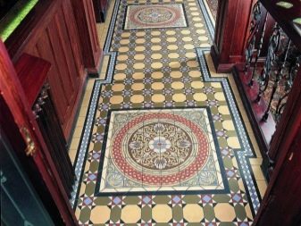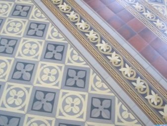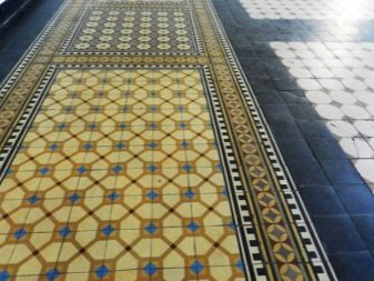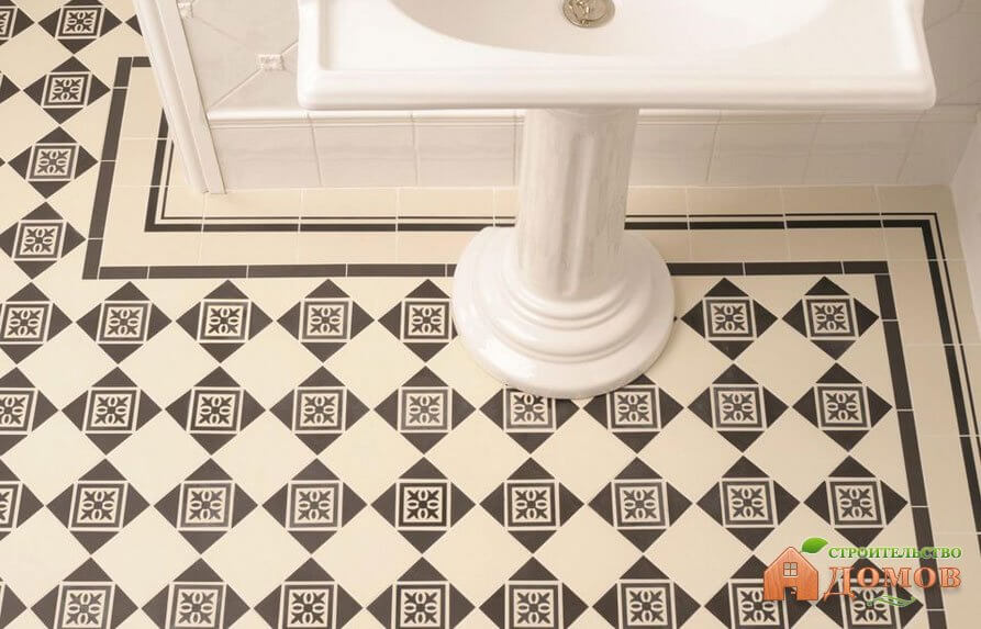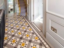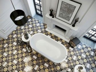 - To emphasize the ornament of the floor tiles on the floor, lay a homogeneous tile without a pattern around the perimeter of the floor covering, which will give an interesting accent to the interior.