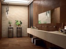 Now very popular glossy tiles with imitation of leather, textiles, metal. Very popular models of wood. Over the years, ethnic style and antique design has not gone out of fashion. This finish will look good in the bathroom and in the kitchen.