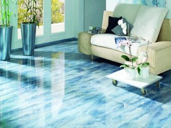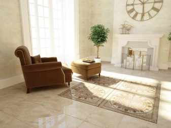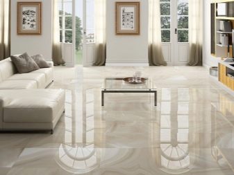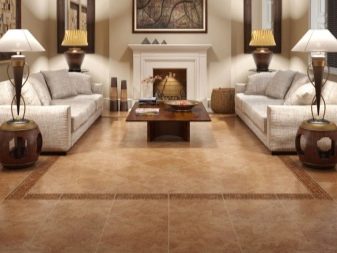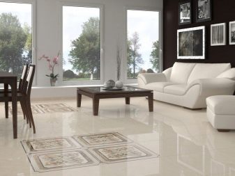 Sometimes the ceramic coating is chosen for the decoration of the living room.Such a floor can look stylish and interesting. For example, from a light tile you can lay out patterns, diversify a monophonic finishing canvas of the floor. With the help of tiles of different shades you can distinguish a large living room into several zones (for example, you can use several pastel colors).