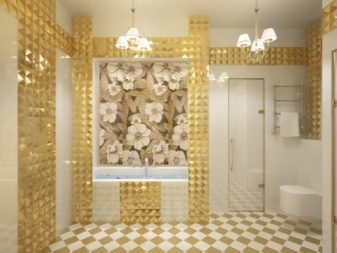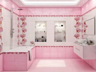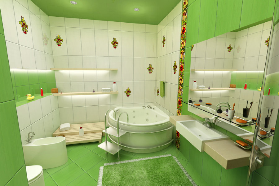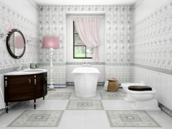 Most often bright floor tiles adorn the bathrooms. This is a practical solution, such a coating is not afraid of moisture, and also easy to wash. The design of this facing in a bathroom can be the most various. Since the bathroom is a small non-residential space, bright colors and contrasting combinations are acceptable along with light tiles.