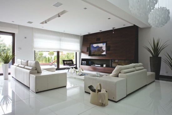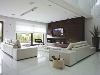 In the modern interior (for example, high-tech style) light finish looks stylish. However, in this case, you need to choose a warm color and matte texture. Modern interiors are concise, so in living rooms it is important to take into account the ease of perception of the material. Difficult designs and a combination of finishing with a motley scale are inadmissible.