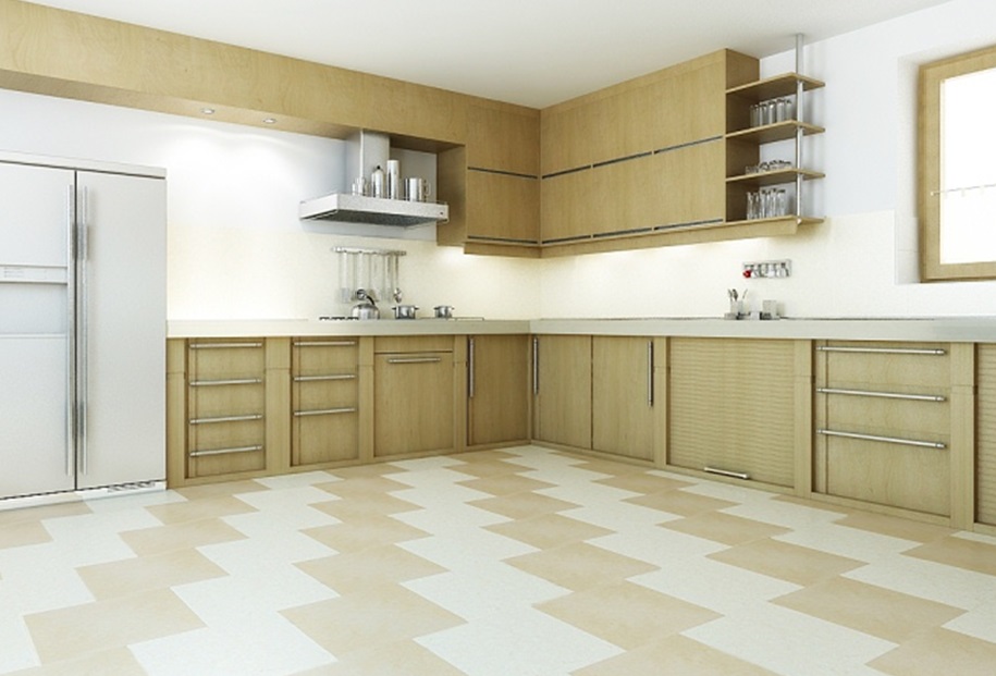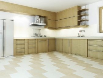 Floor light tiles are perfect for the kitchen. In this case, it is worth considering matte and glossy options. The bright and brilliant texture of the tiles will make the kitchen visually spacious and stylish. It is especially interesting to look varieties with contrasting inserts, for example, in the form of carpet. So you can beat the zone of greater cross.