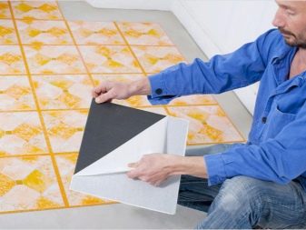 Self-adhesive linoleum tile fits the same way as the tile on the glue, but still a little easier, because to apply glue in this case is not necessary.