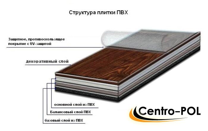 The floor tile consists of six layers: base made of PVC, two minor layers with the addition of quartz, balanced fiberglass, and then decorative and protective. This form of PVC is made using hot casting. The main material is melted and poured into a special form, after cooling, which is extracted from it ready to use tile.