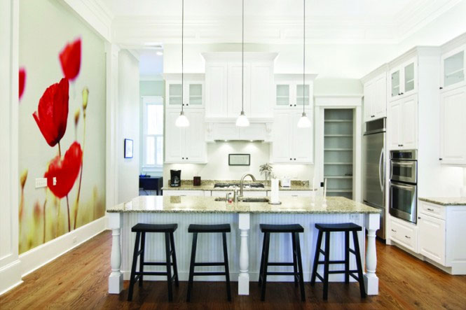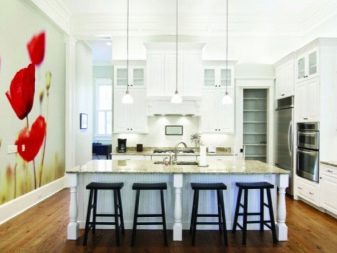 It is the kitchen that is a good example, as it always needs various materials to cover. A good option for wall decor in the kitchen is wallpaper. They will give the kitchen the spirit and atmosphere of something light and romantic, or bright and energizing. The working part is always broken by a tile, tile or decorative stone to facilitate the cleaning process. Loose walls are best painted in light and pearl colors, and notes of dark red will give the kitchen a gloss and comfort.