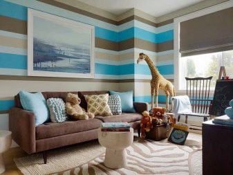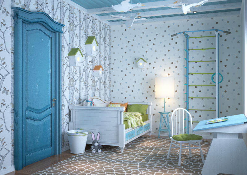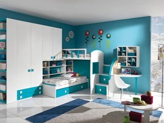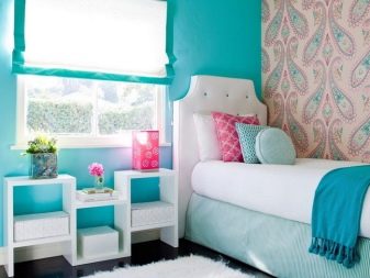 - Fiction. Children and adolescents really like the rich turquoise color. Therefore, it is logical to use it for the game room, in which the kid spends so much time. Here you can combine two types of wallpaper: plain turquoise and decorated with a small pattern in the form of flowers or small circles.If the base of the wallpaper is decorated with circles of orange, yellow and green, the room will be very cheerful and bright.