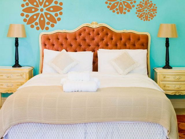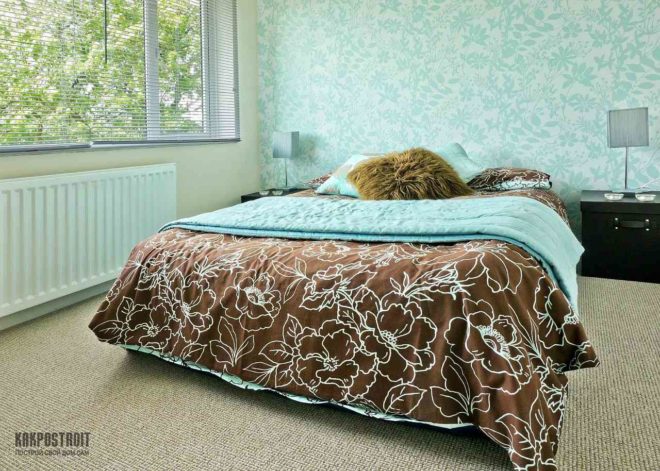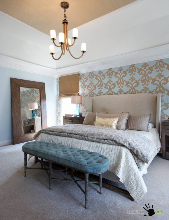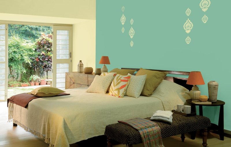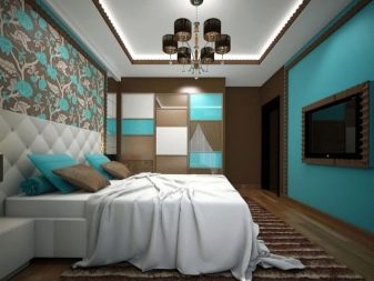 - Bedroom. Experiment with shades of turquoise can be and bedrooms. The best in this room is a combination of turquoise and beige. Highlight one wall with bright turquoise wallpaper, and paste the other three with beige wall coverings. In such a bedroom it will look good furniture made of natural wood - oak bed, pine set or rattan chairs. Finish a cozy composition of a light-colored plaid or a small fur rug next to the bed.