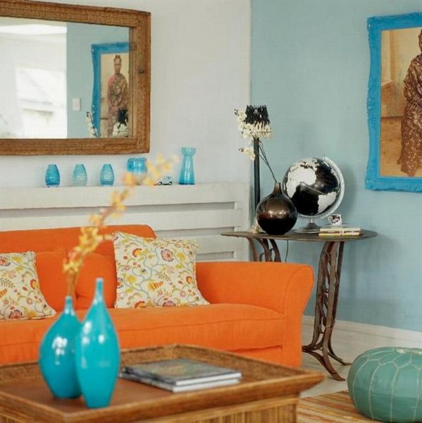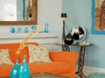 In order for this combination to play correctly, you need to combine turquoise with light shades at the base, and orange should be used only for accents in the interior.