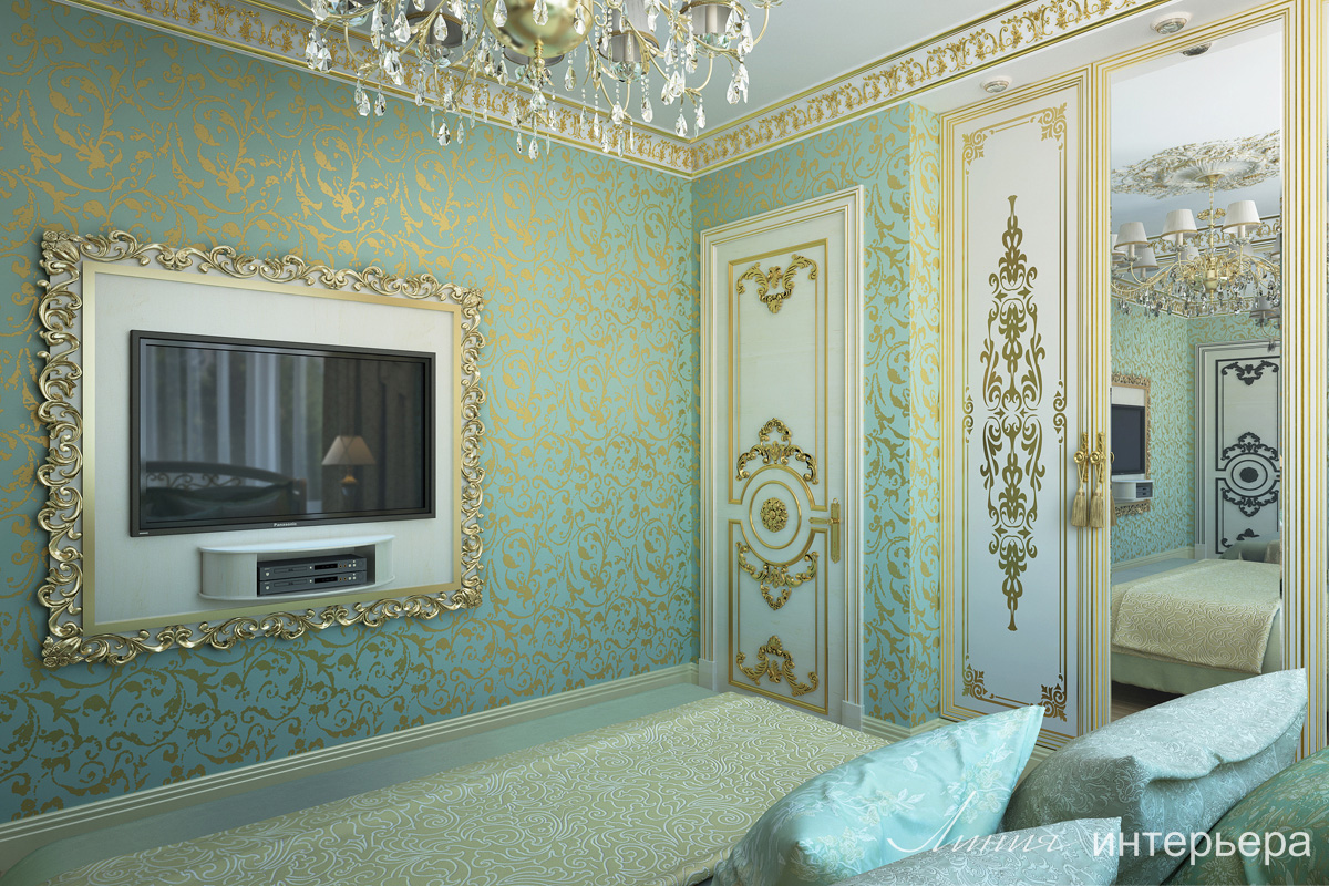 - Chocolate. If you want to create a noble interior that will look really expensive, pay attention to the combination of turquoise with a rich chocolate tint. This can be done in different ways. Most often, this shade of brown is present in the furniture. And the walls remain turquoise. It is interesting to look and plain wallpaper with gold, or rather, with exquisite gilded monograms.