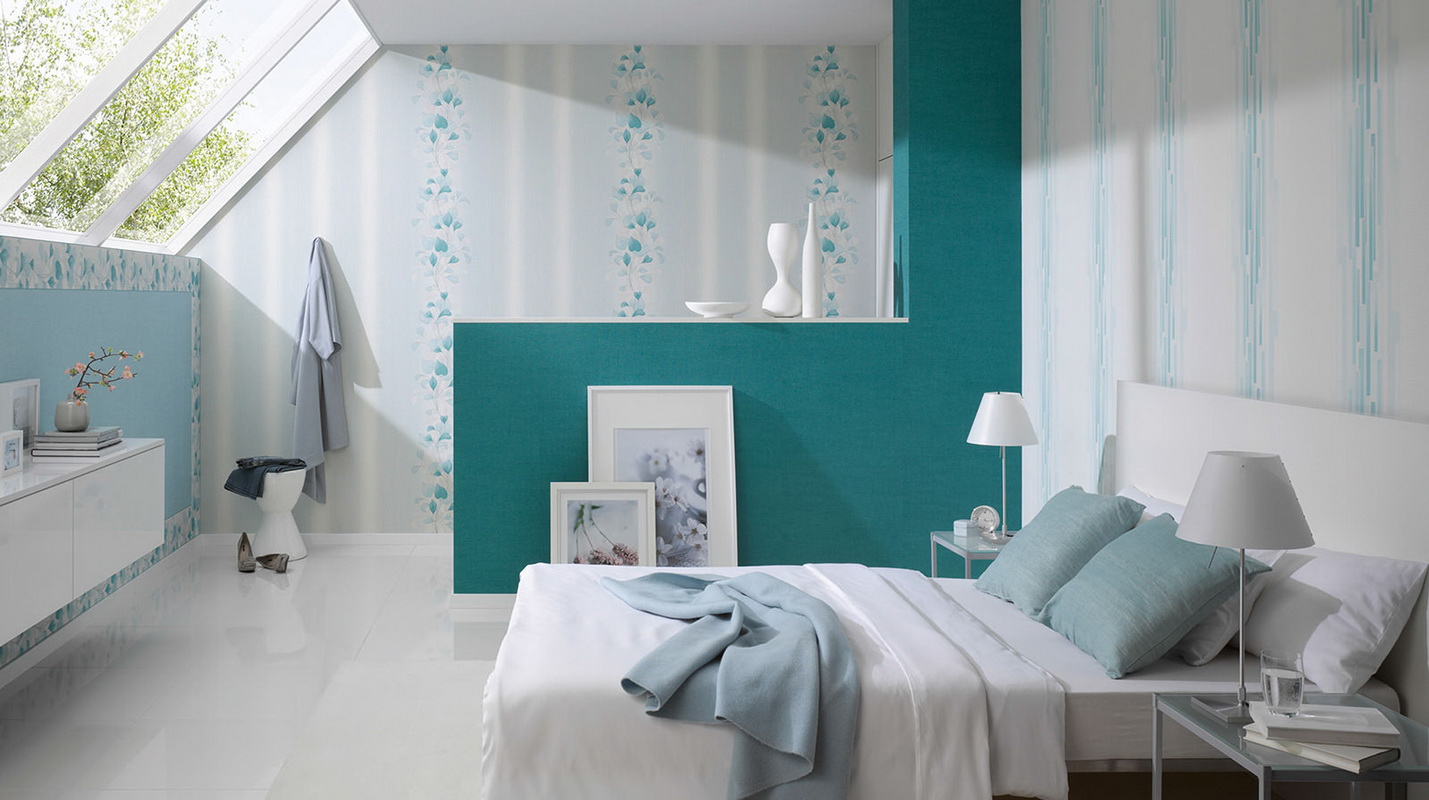 - White. Another classic shade that you can “make friends” with turquoise is white. This combination looks very gentle, especially if the turquoise wallpaper you choose the most delicate and bright. This color combination is ideal for bedrooms.