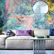 - Watercolor on the wallpaper will always look modern and very attractive. Watercolor stains allow you to create interesting accents in the interior, diversify the space, add dynamics to it. Canvases can be purchased as a finished drawing, and create a masterpiece with their own hands. To create a watercolor pattern or even a full-fledged picture it is not necessary to be an artist. You will need only a wallpaper for painting and a little imagination.