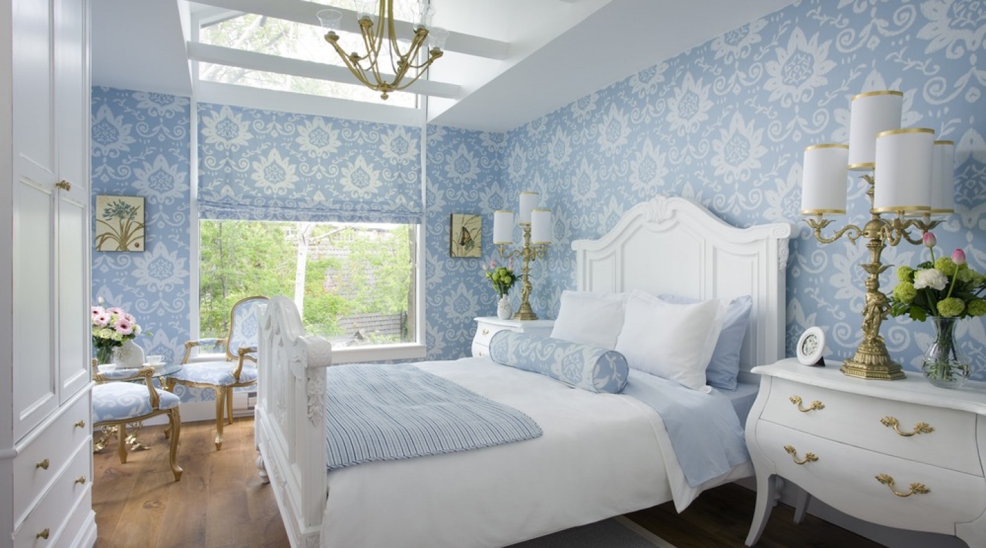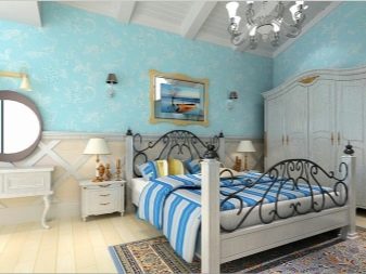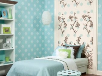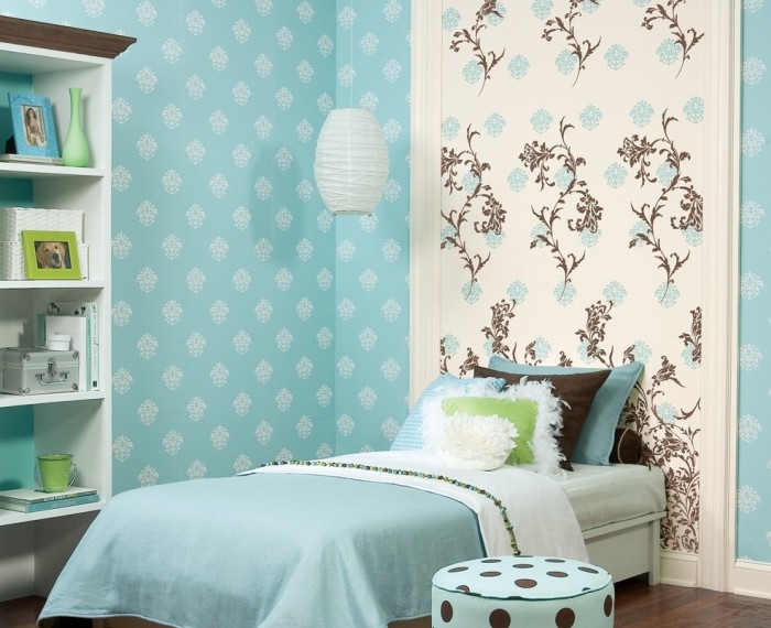 - Even the simplest paper canvases can make a room “play up” with new colors if you combine several types of wallpaper. Light blue walls decorated with white monograms look great in the interior of the bedroom. The design solution is the insertion of their white wallpaper at the head of the bed. An ornament of blue and coffee flowers concisely connects the wall decoration with the overall style of the room.