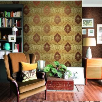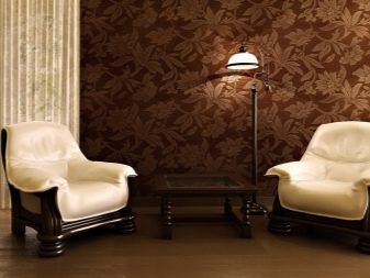 - Brown spectrum in the interior it looks spectacular in any style directions. Dark chocolate-colored wallpaper in a tandem with gold lettering will add room chic and luxury. Light materials in the color of coffee with milk are laconic and restrained, suitable for any classic interior.