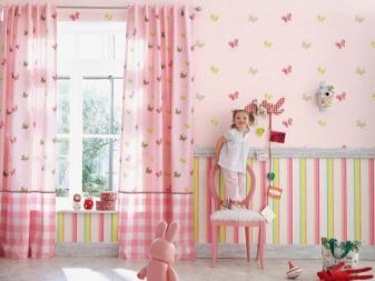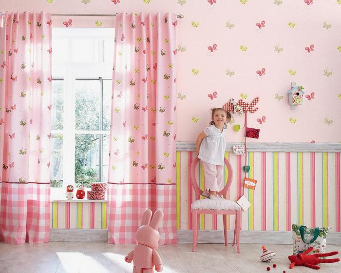 - Children's room does not do without gentle pastel colors and touching prints. Playful butterflies on a pink background like any girl. To introduce some severity and dilute the sentimental pattern will help horizontal combination of monochrome wallpaper. Yellow-pink classic stripes blend harmoniously with the pattern at the top of the walls. To close the joint, a wooden curb is used.