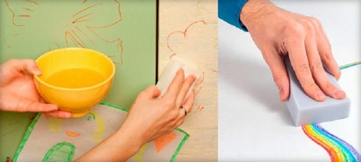 Colored wax pencils with thick leads are very much loved by modern children. With vinyl and washable wallpaper, you can display them with nail polish remover. Paper wallpaper will be difficult to clear. A relatively new development - melamine sponge, can be a great solution in this case.