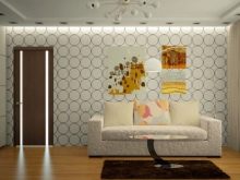 A less common way to design walls is to use canvases with different patterns and textures, but with a common range of colors. Reception is quite complicated, for a beginner to implement it will not be easy.