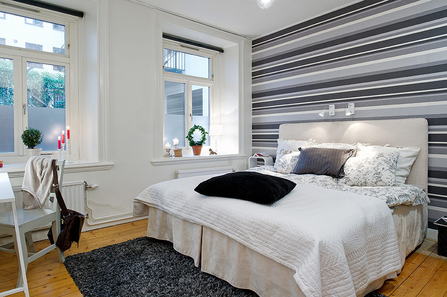 The principle of combination is similar to the first, but it is based on wallpaper with a horizontal pattern.Due to the visual effect of the horizontal lines of the wall of the room are extended, the room becomes more spacious.