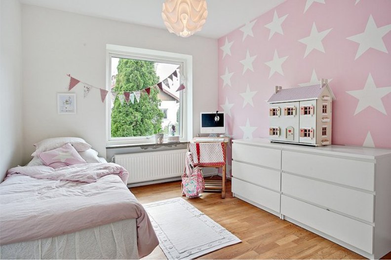 It is necessary to stick to the edges of reasonable, it is better to even divide the space into zones, because this is a combined space for sleeping, playing, practicing and relaxing.