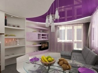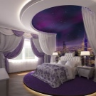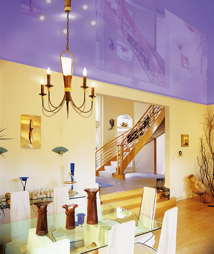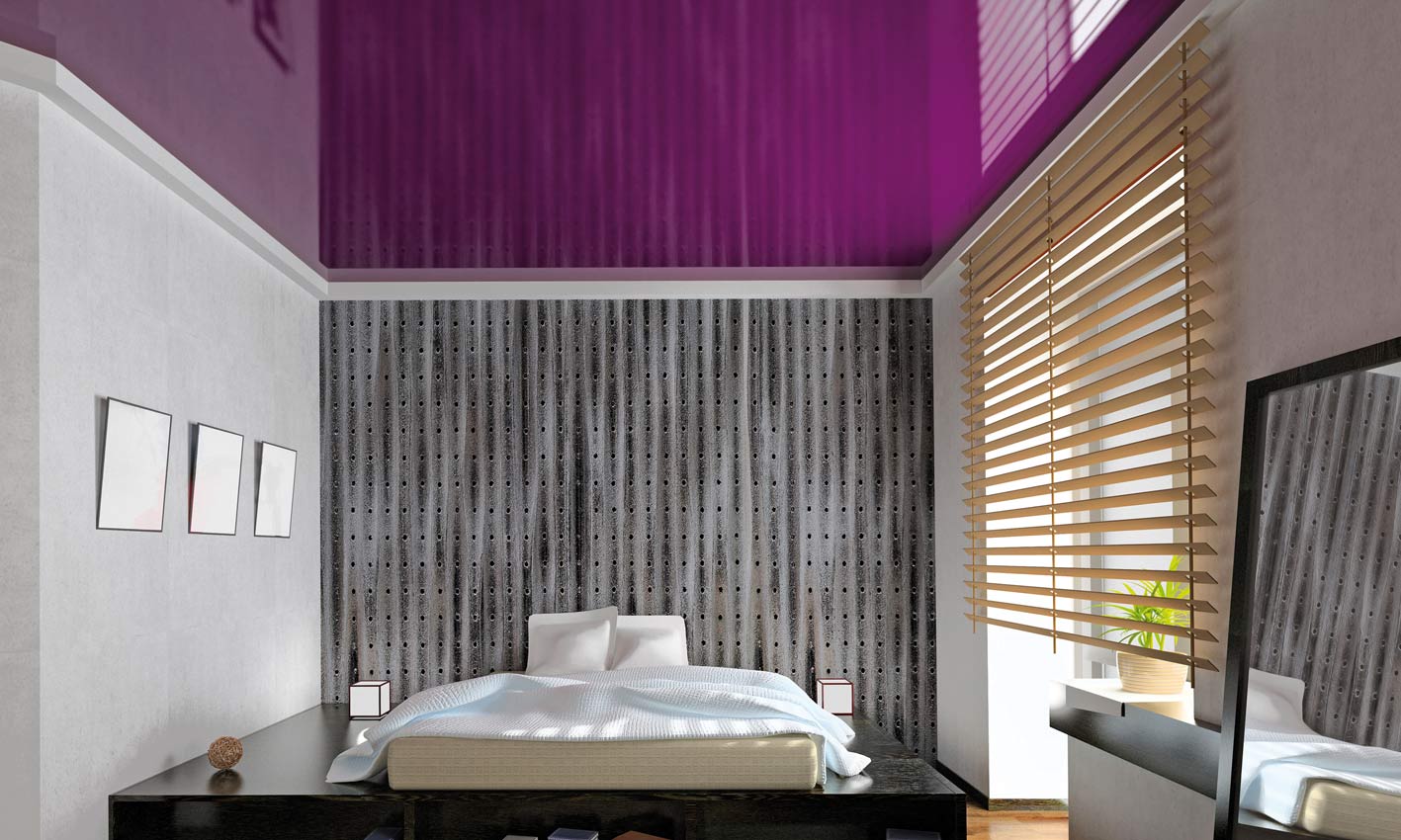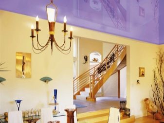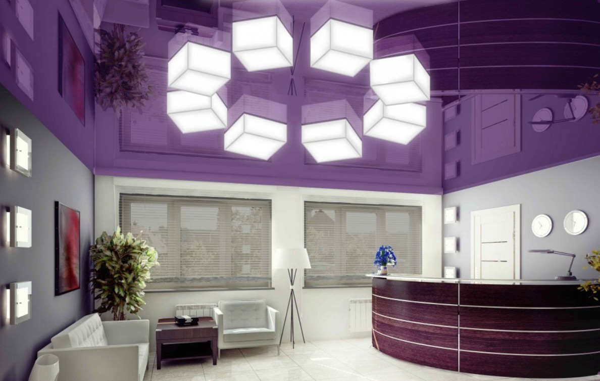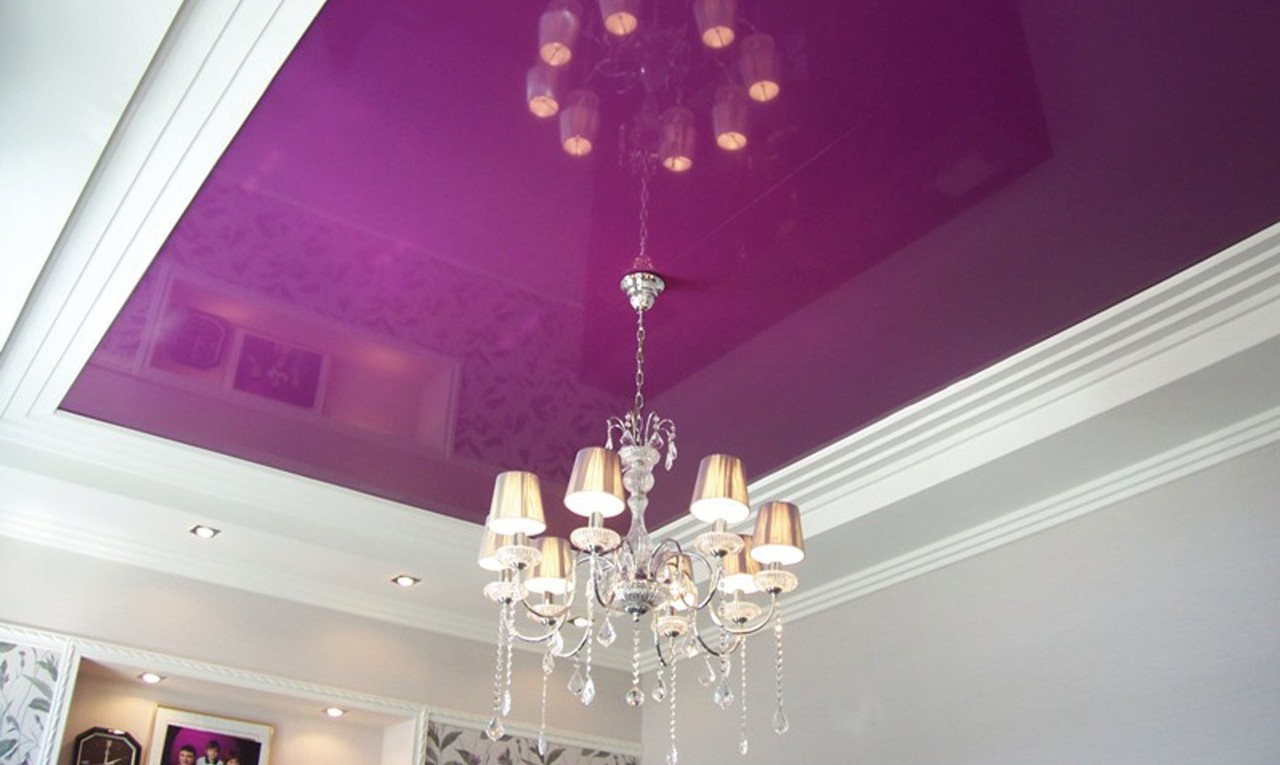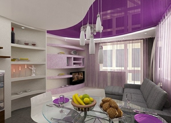 Interiors, the creation of which use the lilac and violet shades of the palette, will never go unnoticed and will be astonishing for a long time. It is always original and fashionable. But do not forget that choosing ceilings of similar colors, it is necessary to evaluate the room as a whole. The ceiling should look harmoniously, without destroying the overall design of the room. It is necessary to choose the correct tones of vertical enclosing structures of walls and objects of the room, allowing you to create a favorable mood and find the balance of color combination.