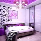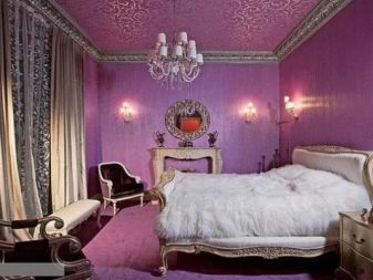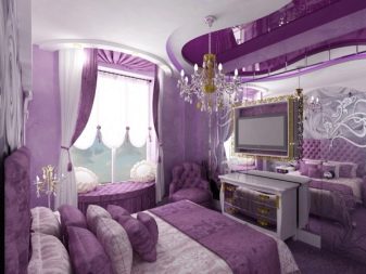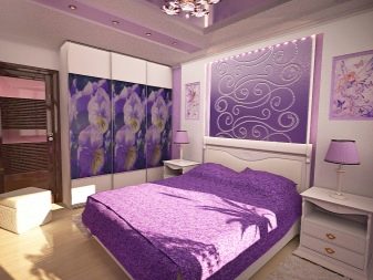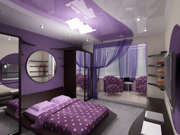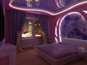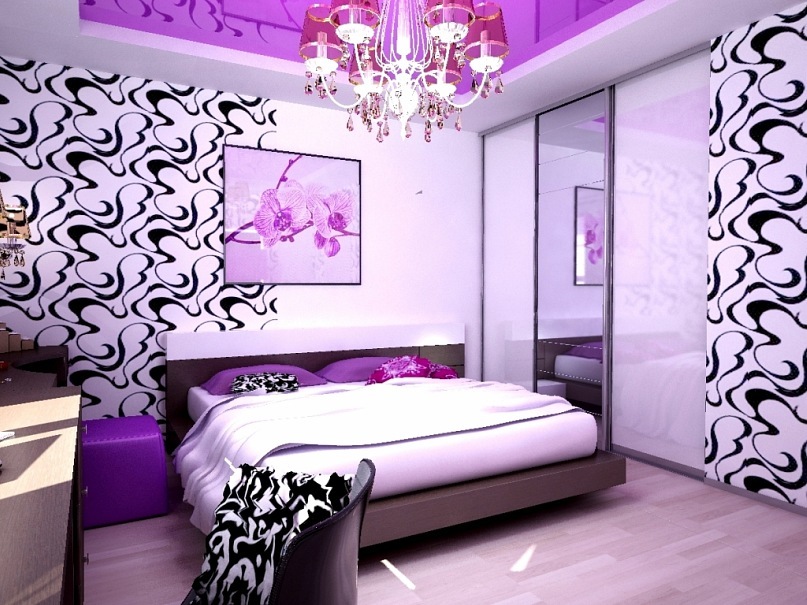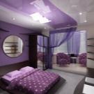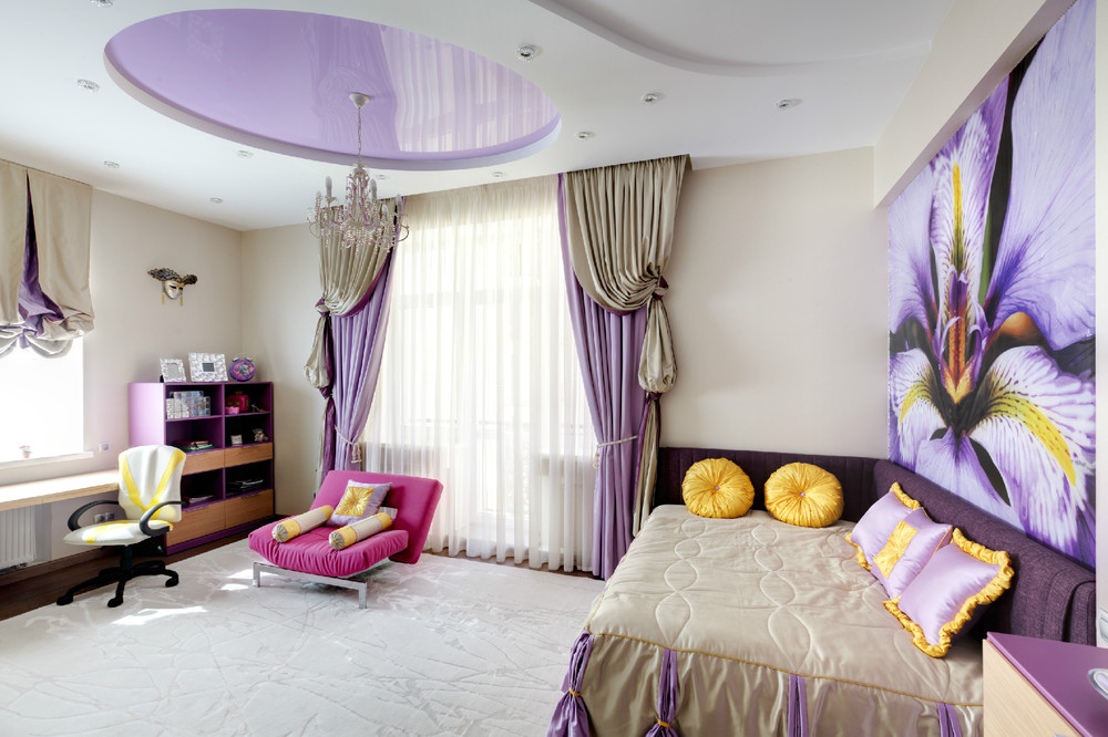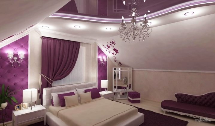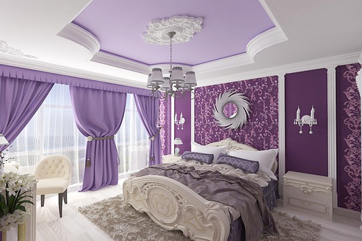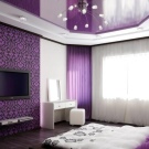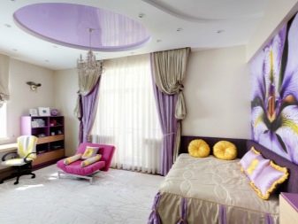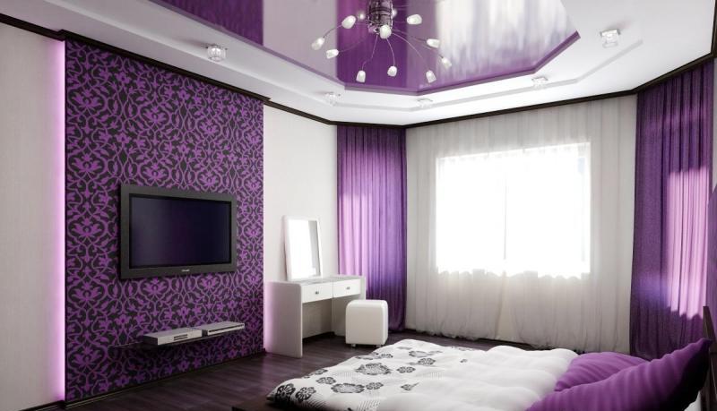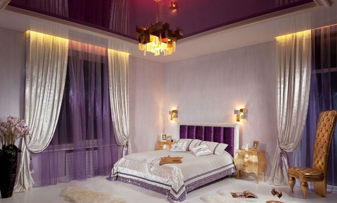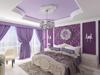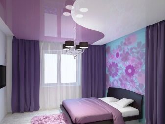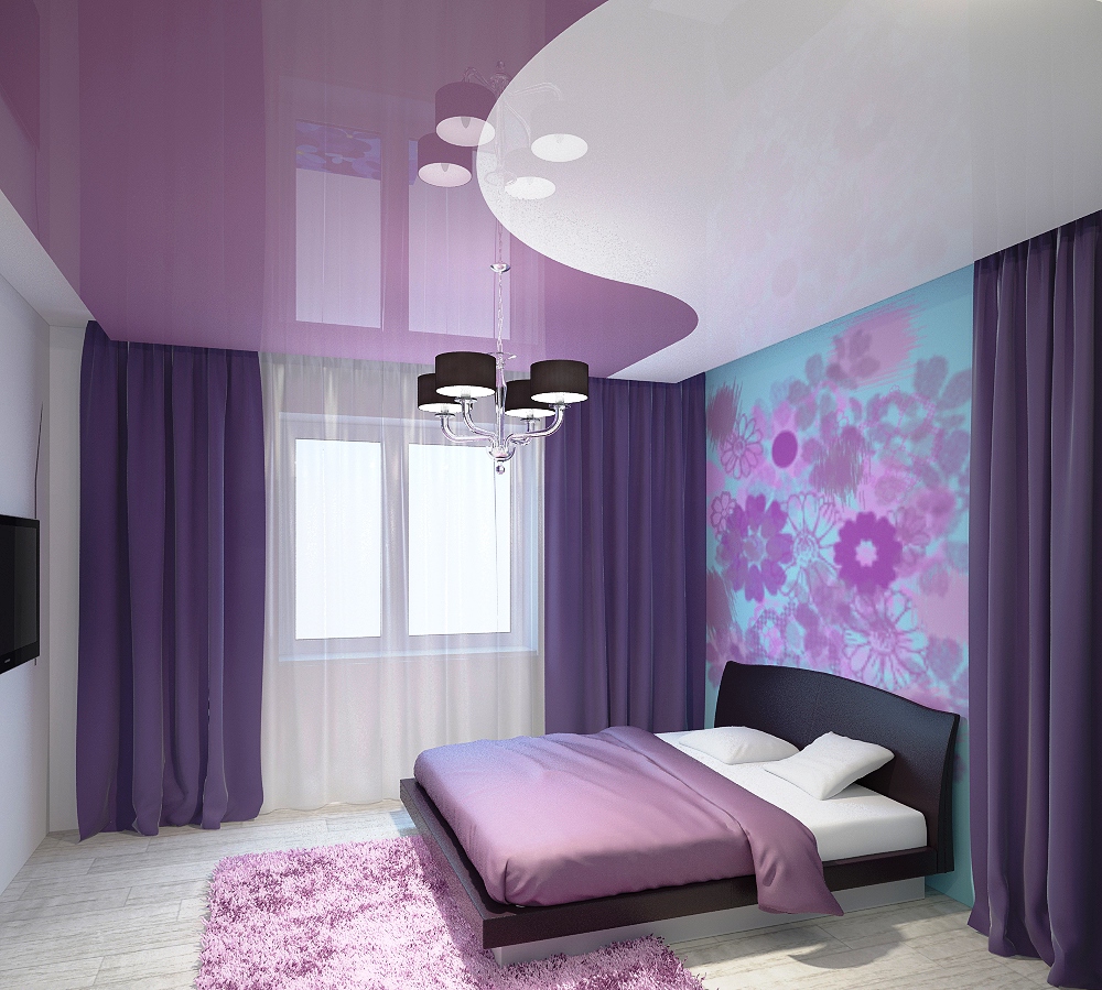 For adult bedrooms, the lilac ceiling can be installed both in saturated and blurry shades, creating a mood of pacification and charging with energy. And the walls with harmoniously selected wallpapers only emphasize the originality of the idea. The main thing is that the rooms are bright and sunlight gets into them.otherwise the lilac ceiling will become dim and oppressive, and even the colors of the walls will not be able to help eliminate gloom.