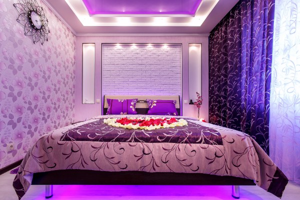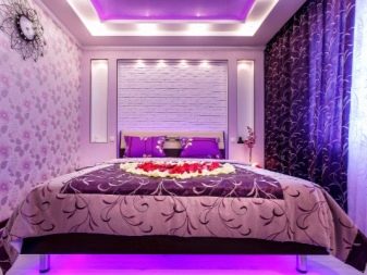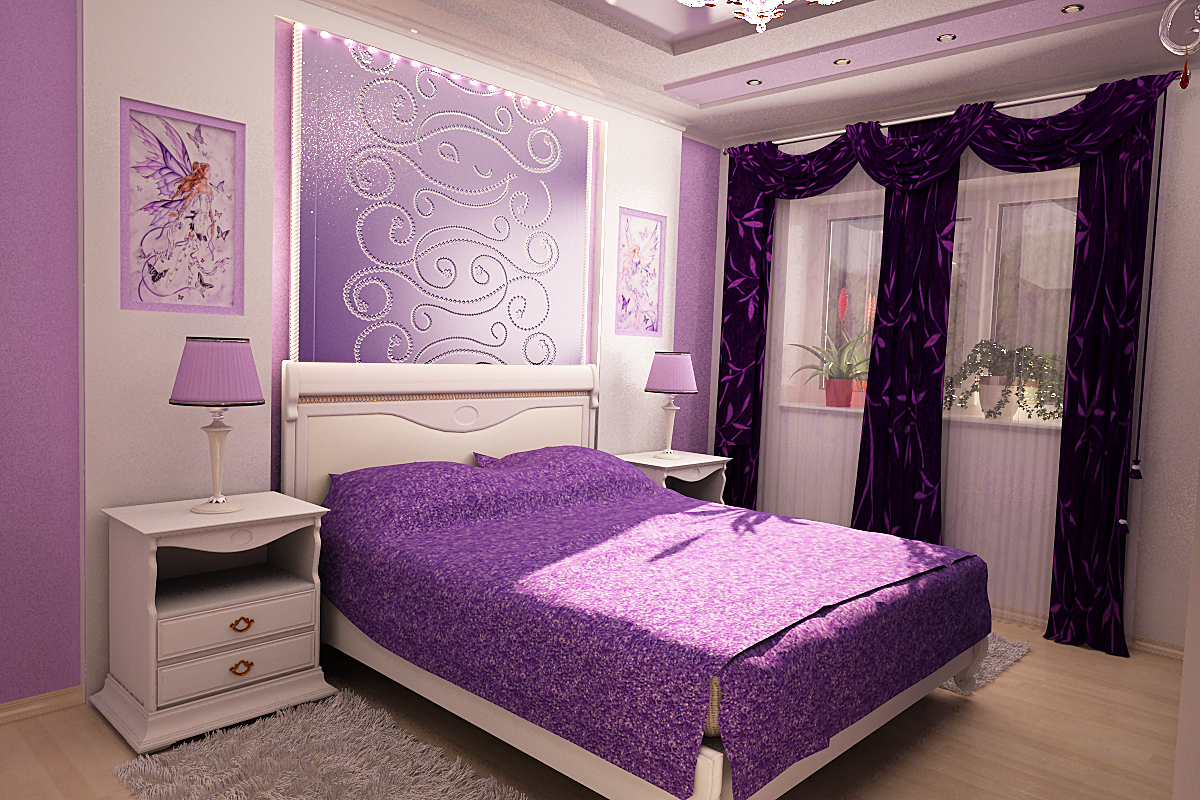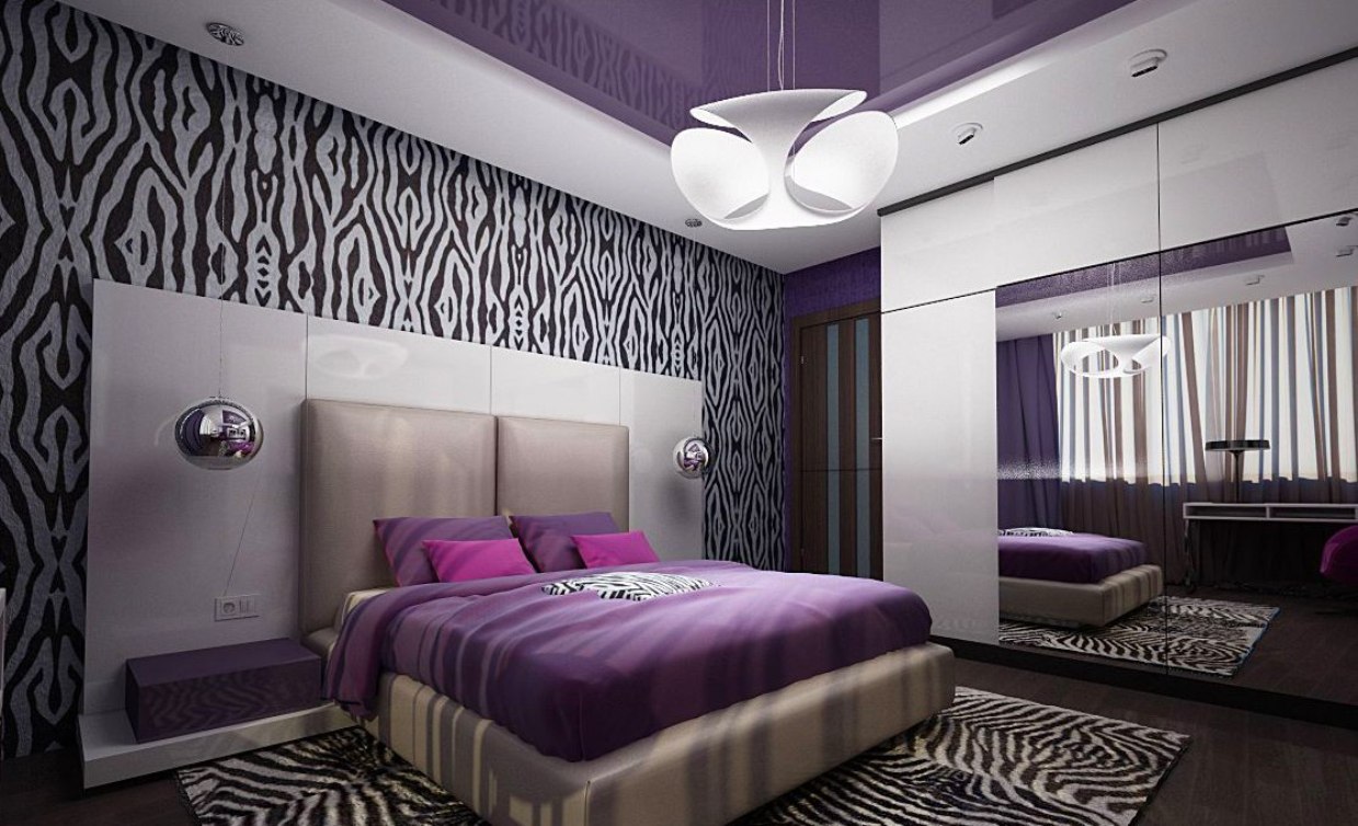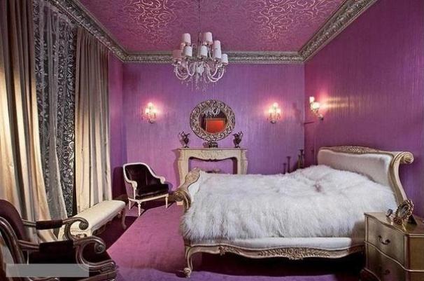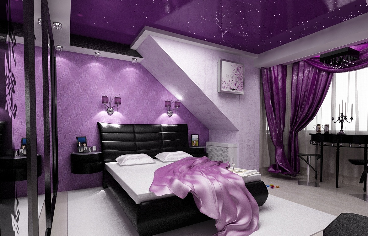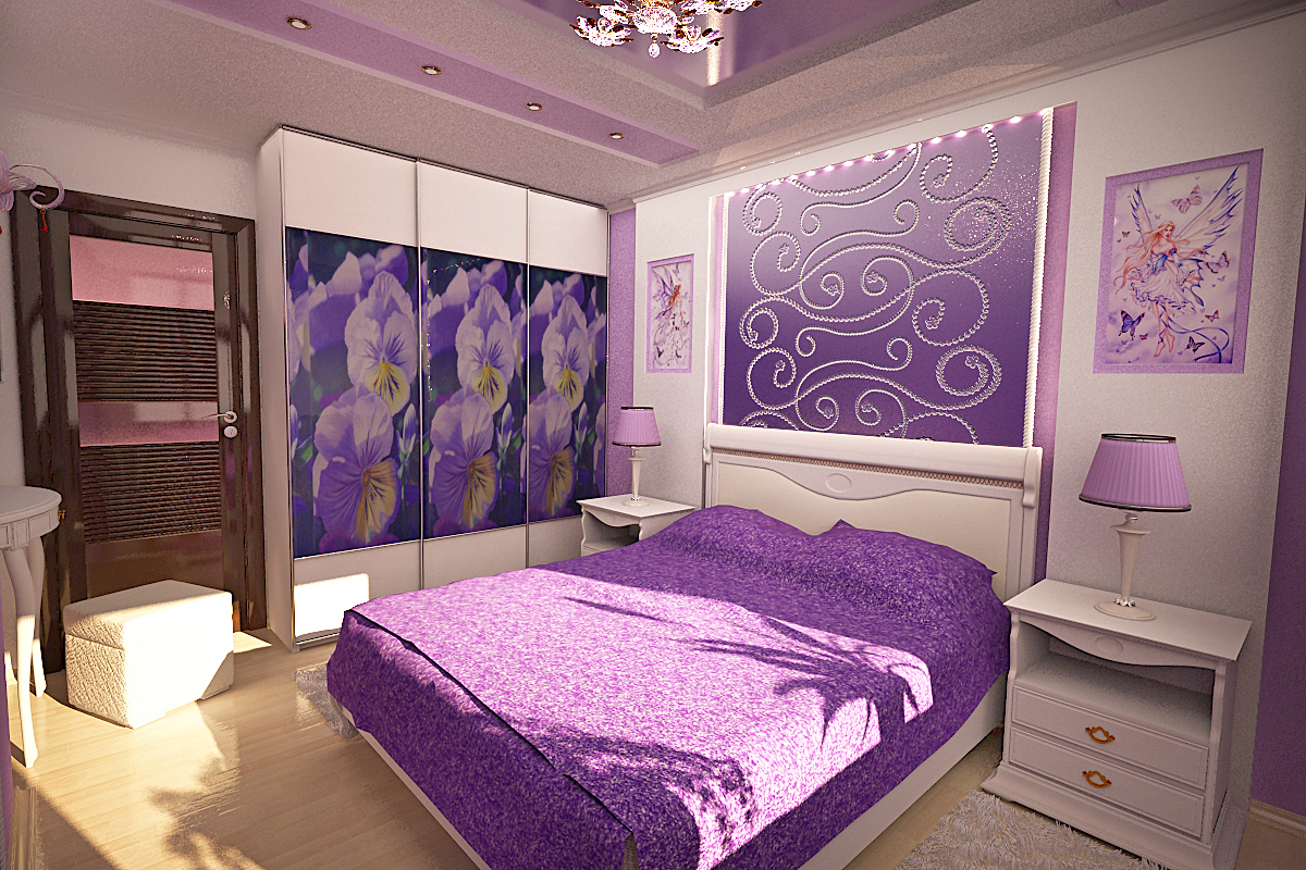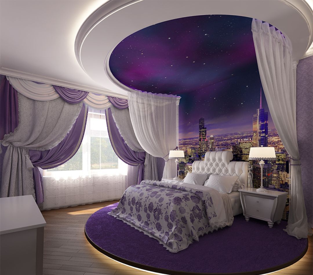 For adult bedrooms, the lilac ceiling can be installed both in saturated and blurry shades, creating a mood of pacification and charging with energy. And the walls with harmoniously selected wallpapers only emphasize the originality of the idea. The main thing is that the rooms are bright and sunlight gets into them.otherwise the lilac ceiling will become dim and oppressive, and even the colors of the walls will not be able to help eliminate gloom.