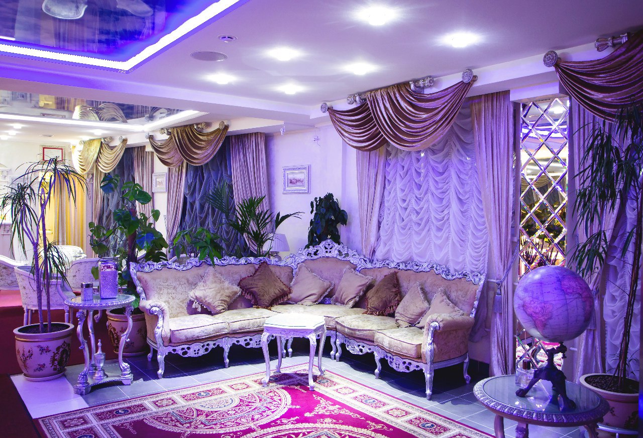 When combining lilac ceilings with a combination of chocolate, silver, menthol and peach tones on the walls, the appetite will not take long.