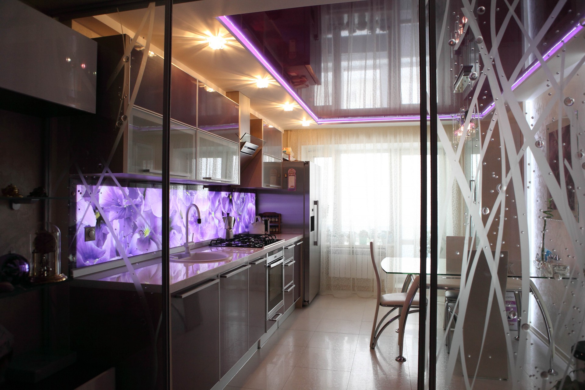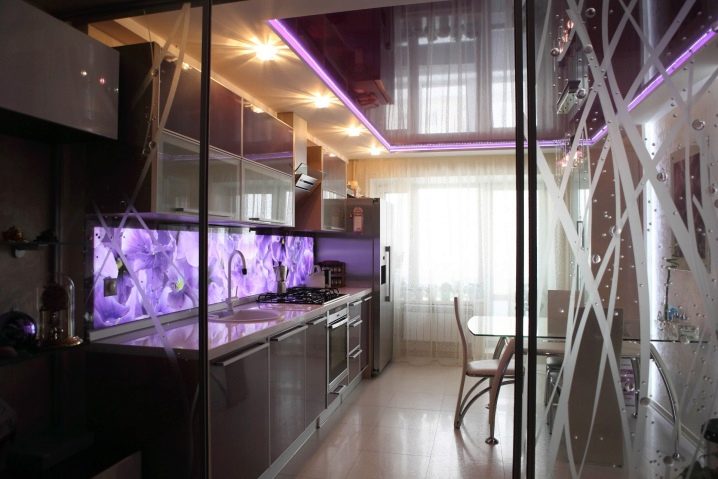 In kitchens with lilac ceilings, it is better to use light shades of wallpaper or other finishes, since these rooms are usually small. White, beige, light gray or pink walls can be originally combined with rich accents of purple, red, dark brown or black, and if you put these accents in the colors of furniture, textiles or dishes, the kitchen will become even more stylish.