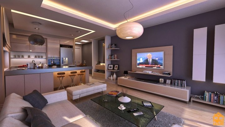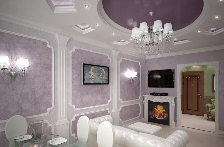 At the junction of the lilac ceiling and any matched shade of the wall, it is the plinth or fillet that will give a complete look. With proper selection of the width of the fillet, or the use of lighting, you can create additional effects of the soaring ceiling and increasing the size of the room. Behind a plinth, you can hide the wires and cables of television, the Internet and wiring, as well as errors when sticking wallpaper or applying other wall decoration materials.