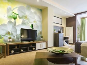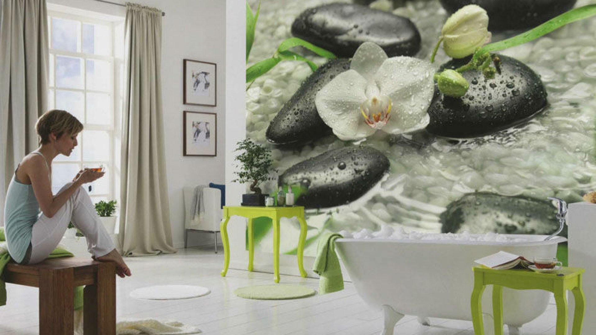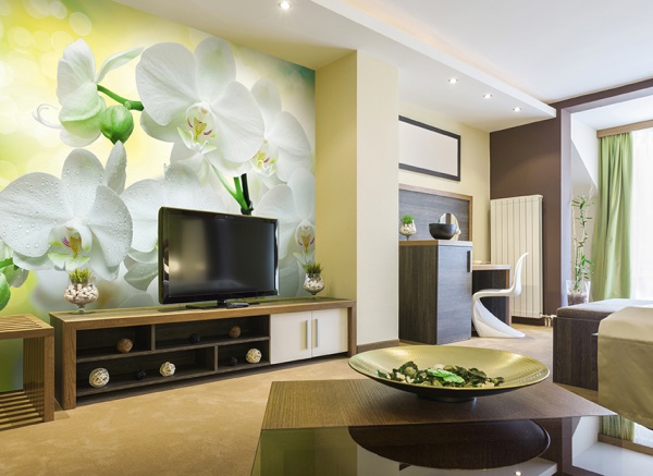 - Photowall-paper with the three-dimensional image. Represent a vinyl coating on a non-woven base with a bright print. The main motifs for such wallpapers are beautiful landscapes, world sights, graffiti and even outer space. White orchid looks impressive in this collection against the background of various shades.
