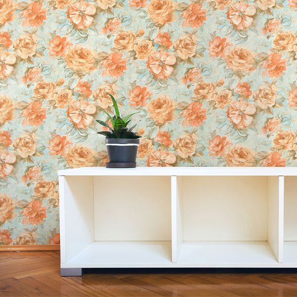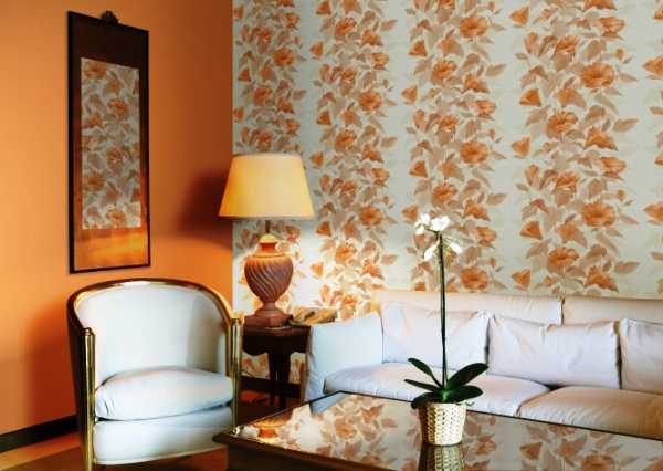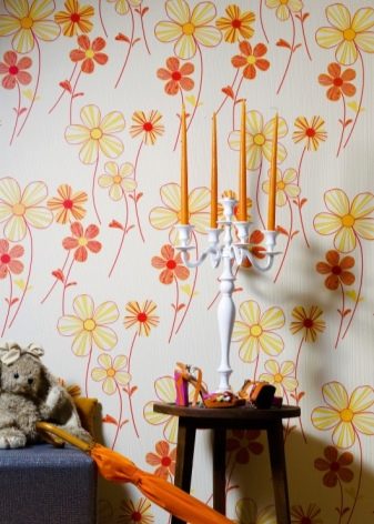 - Warm tones - peach, yellow and pale orange will cheer up, emphasize the style and taste of the owner of such a room. Rolls of this color are perfectly combined with floral prints that repeat the warm shade. Make three walls monotonous, and the fourth, with a pattern, “dilute” the interior - the result will be excellent.