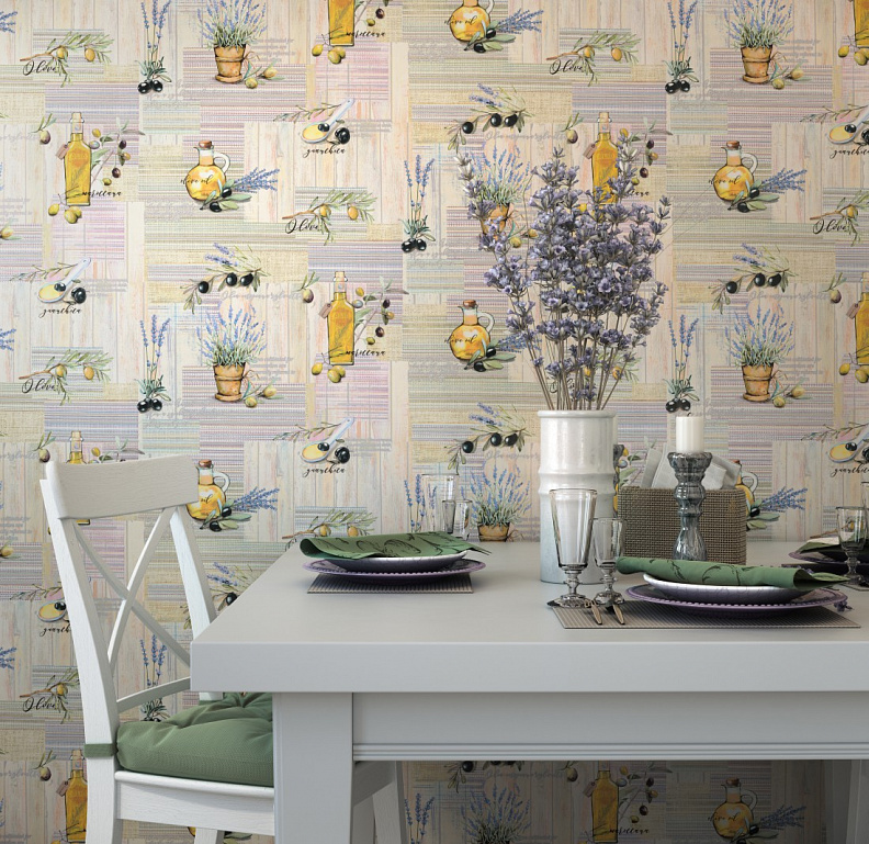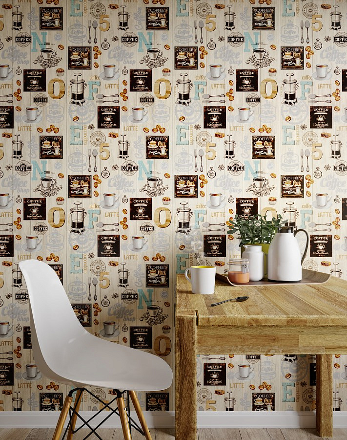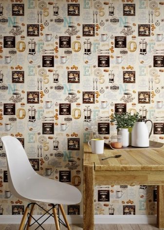Wallpaper from the “Palette” with elements of prints in the “kitchen” theme will suit the kitchen or dining room: a cup of coffee, dishes. Bright, saturated tones of wallpaper will make the dining room more stylish and modern.