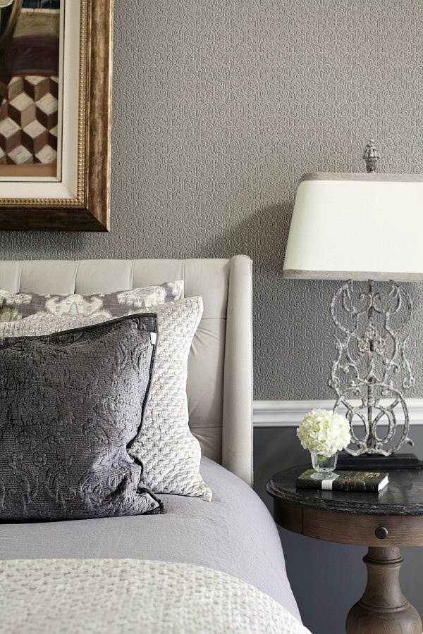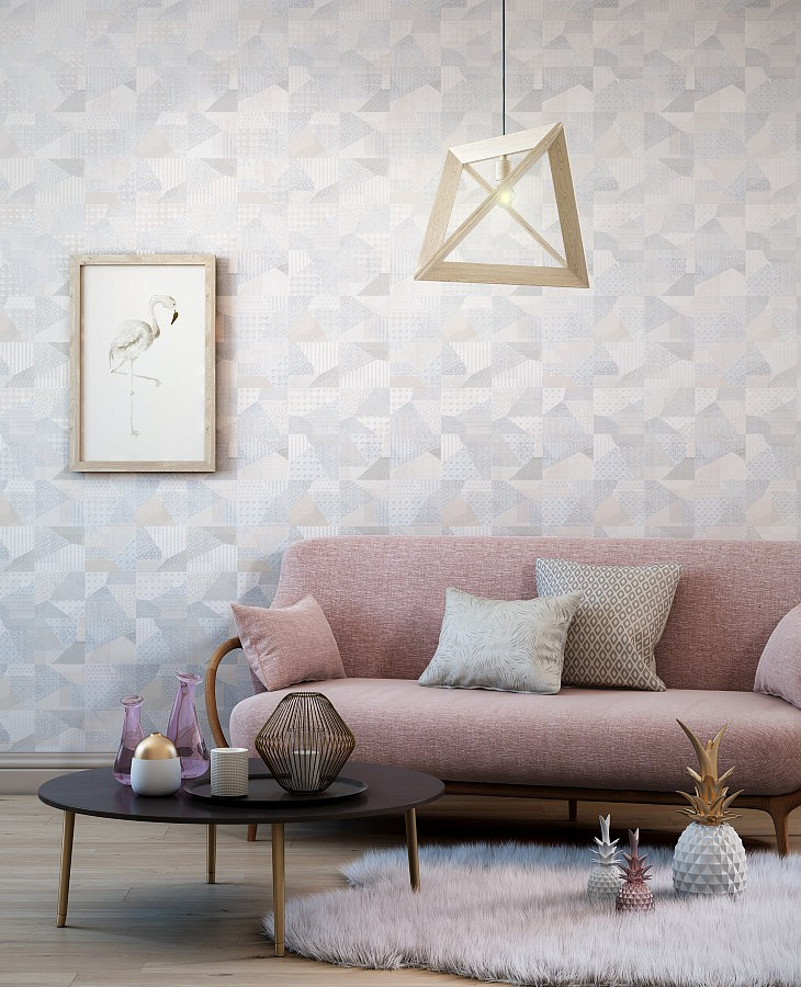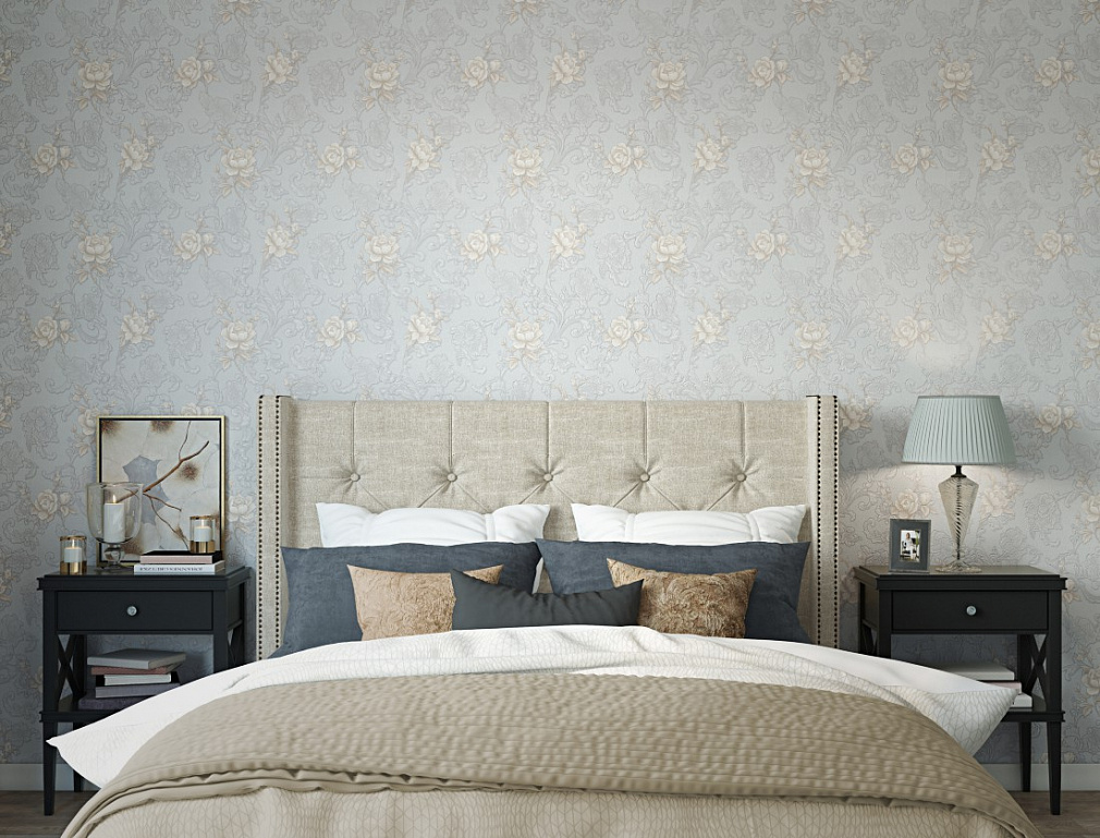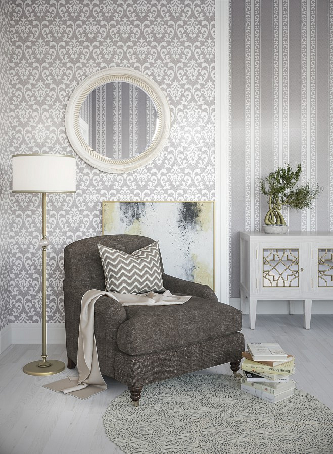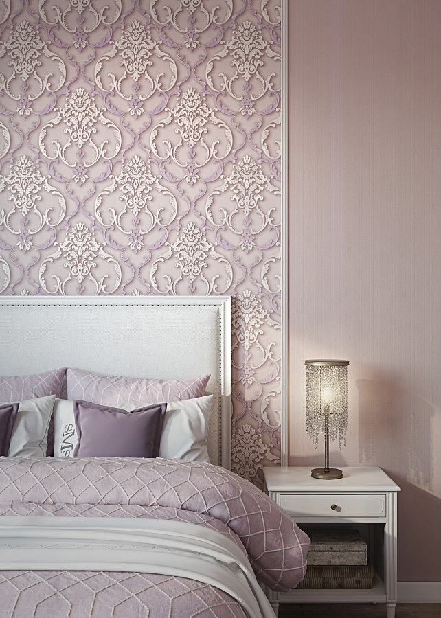 - Gray and beige color, shades of white and hot pink or pale turquoise are perfectly combined. Floral patterns, damask ornament and imitation of the surface of textiles in such colors can create a unique interior in your room.