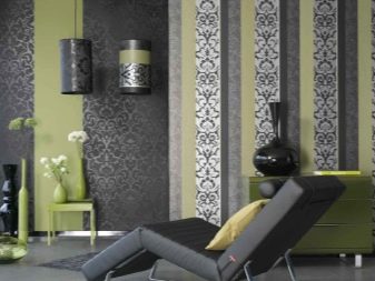 The interior looks interesting alternating wallpaper. Two long walls are pasted over with plain wallpaper, and two short walls - with a combination of a primary color in a strip with a contrasting one. Most often this uses a combination of white and black, as well as red and white. Pasting half in the interior should be used very carefully.