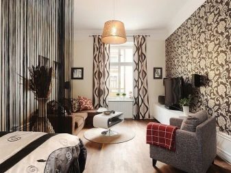- Separation of the wall. In this case, both horizontal and vertical combination is applied. You can use different types of wallpaper on one wall, making the upper part, for example, plain wallpaper, and the bottom - a coating with pictures. Vertical wall separation is also very popular. It is very often used when zoning spacious rooms or studio apartments. So you can select different functional zones and make several small zones from one large room.