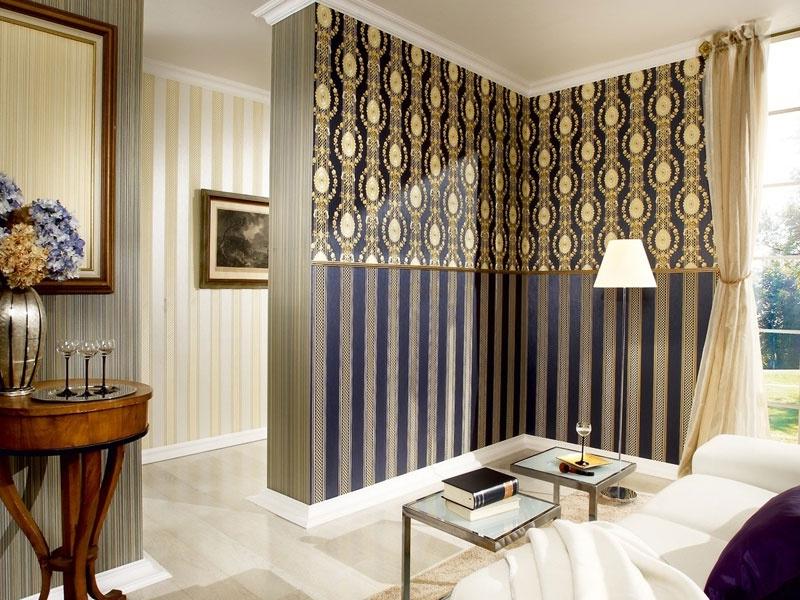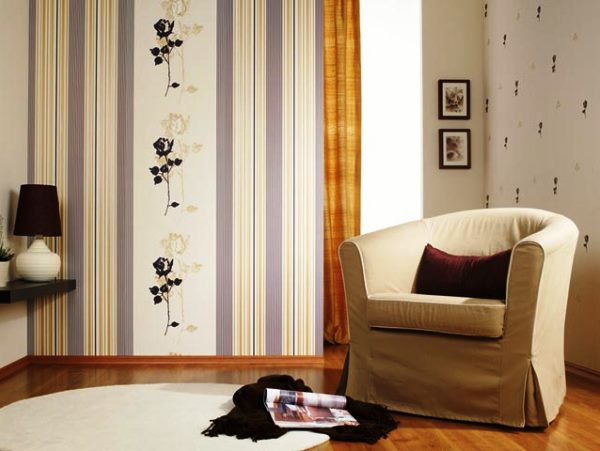 - Combining small vertical stripes. This design technique allows you to change the dimensions of the room. It involves the frequent alternation of strips of wall coverings of different colors. Thus, choosing the right colors and patterns, you can make the interior more spectacular and elegant. In this case, acquire the same width of the rolls or cut into strips wallpaper. The bands alternate either one after two, or one through one, or two through two. One wall can be made monophonic, and on the other one can alternate four or six different canvases at once.