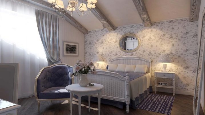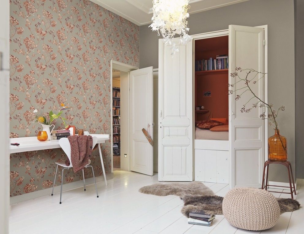 Textile German wallpapers are perfect for rustic Provence. The shade of a flower ornament on sateen variants perfectly harmonizes with wooden beams on the ceiling. Solid laminate highlights the chocolate color in the dormitory.