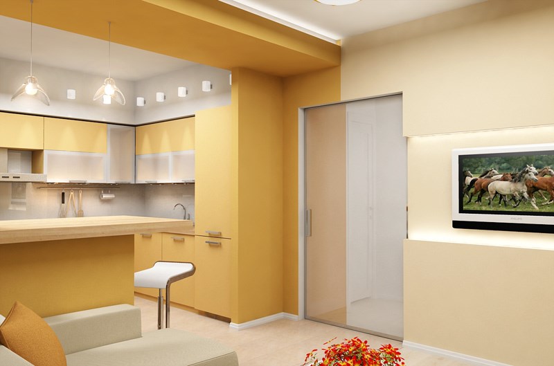This photo is a good example of a combination of two colors in the same room. One of the colors is bright, and the other is neutral, which is recognized as the correct contrast solution. They do not compete with each other, but complement and highlight the advantages that are peculiar to each of them. In this case, the hallway smoothly enters the living room, and the zoning idea is also well implemented.