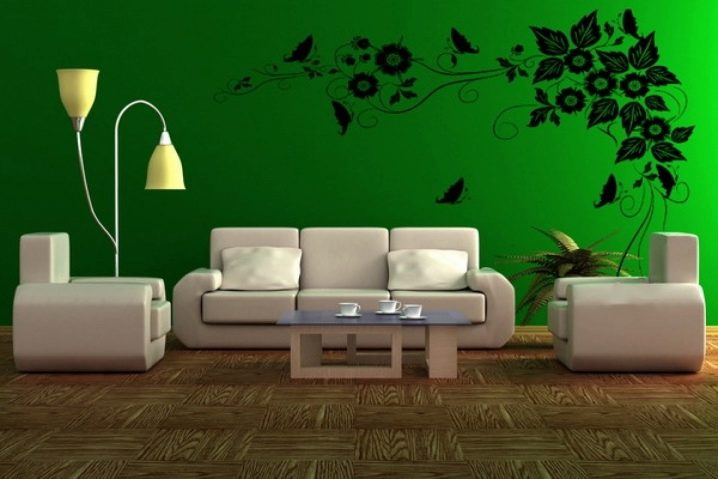 It is interesting to look at the interiors, in which stencils were used. On a deep green background, a composition of black flowers looks unexpected, but very well. Anyone can make such beauty on their own.
