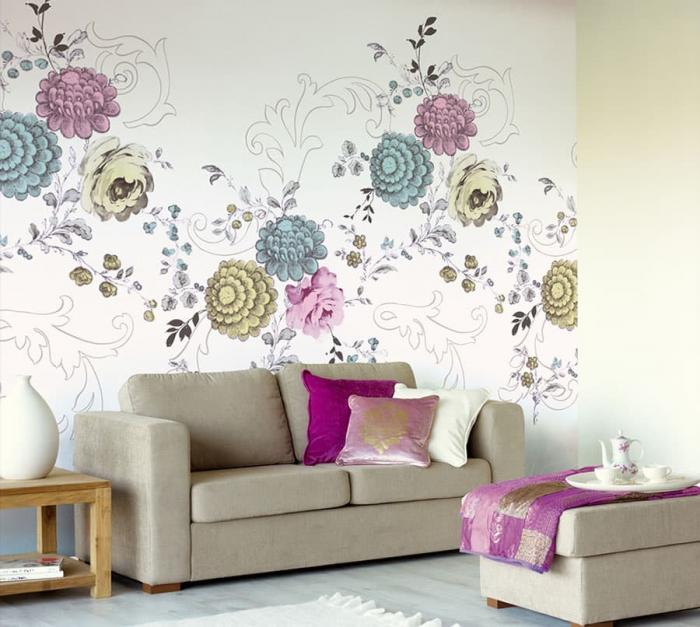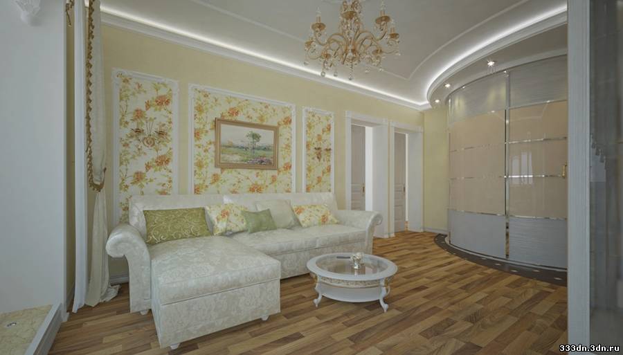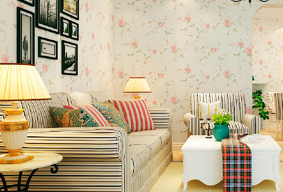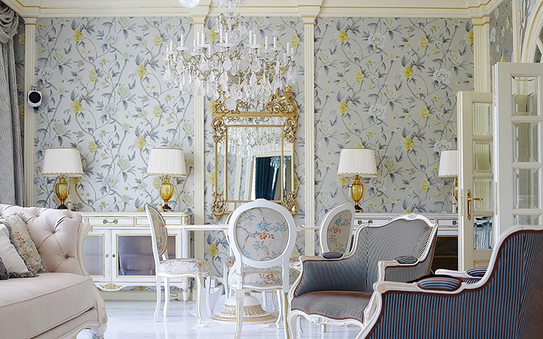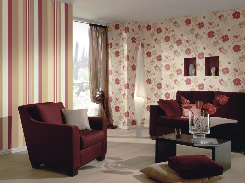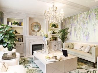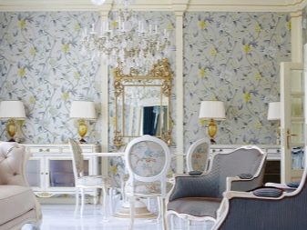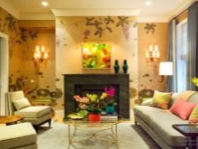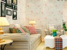 Wallpaper with floral ornament - the card of the popular decor called "Provence". In this style, the use of color images is mandatory conditions. When decorating uses a color scheme consisting of soft pastel tones: lilac, pink, blue, beige. In the living room, decorated in the style of Provence, a gentle and peaceful atmosphere prevails.